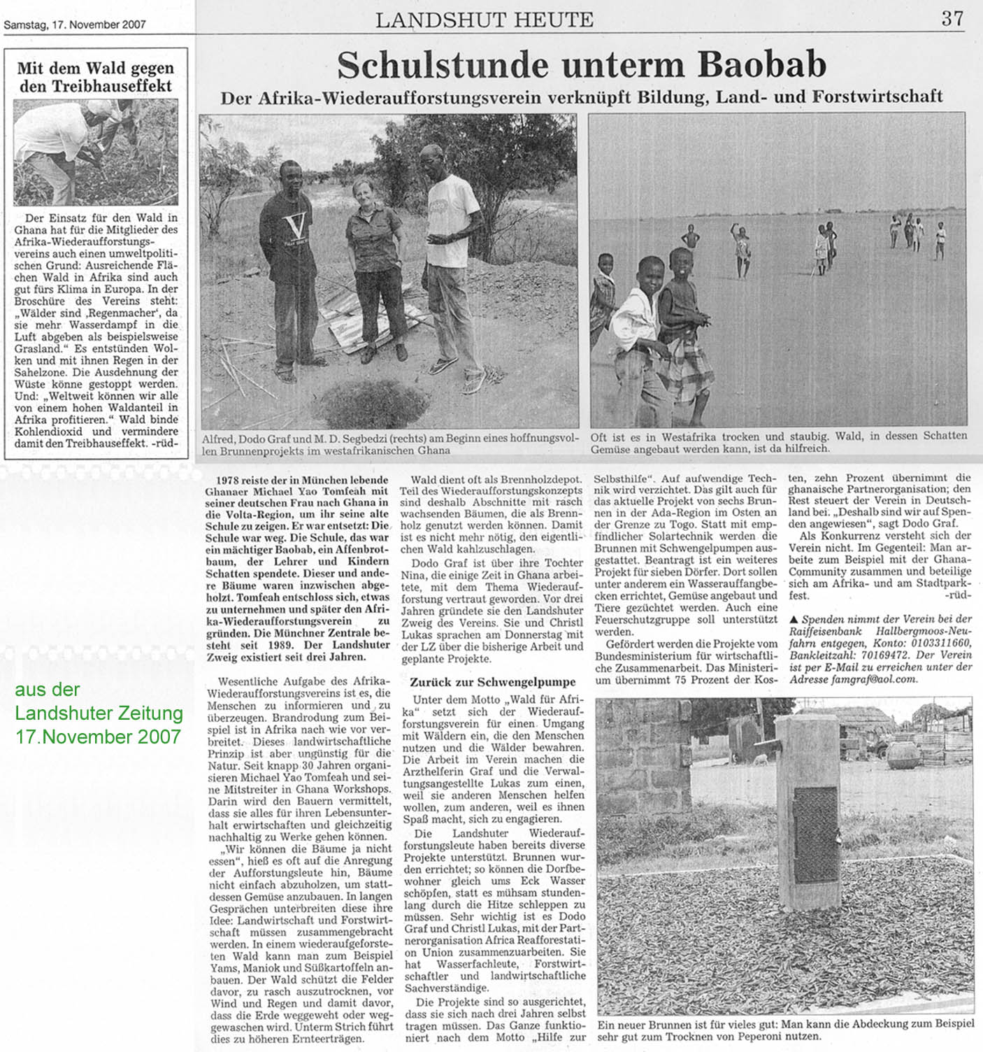 | In einem ganzseitigen Artikel berichtete die Landshuter Zeitung am Wochenende 17./18. November 2007 über die Projekte und Aktivitäten des Afrika Wiederaufforstungsvereins e.V.: |
